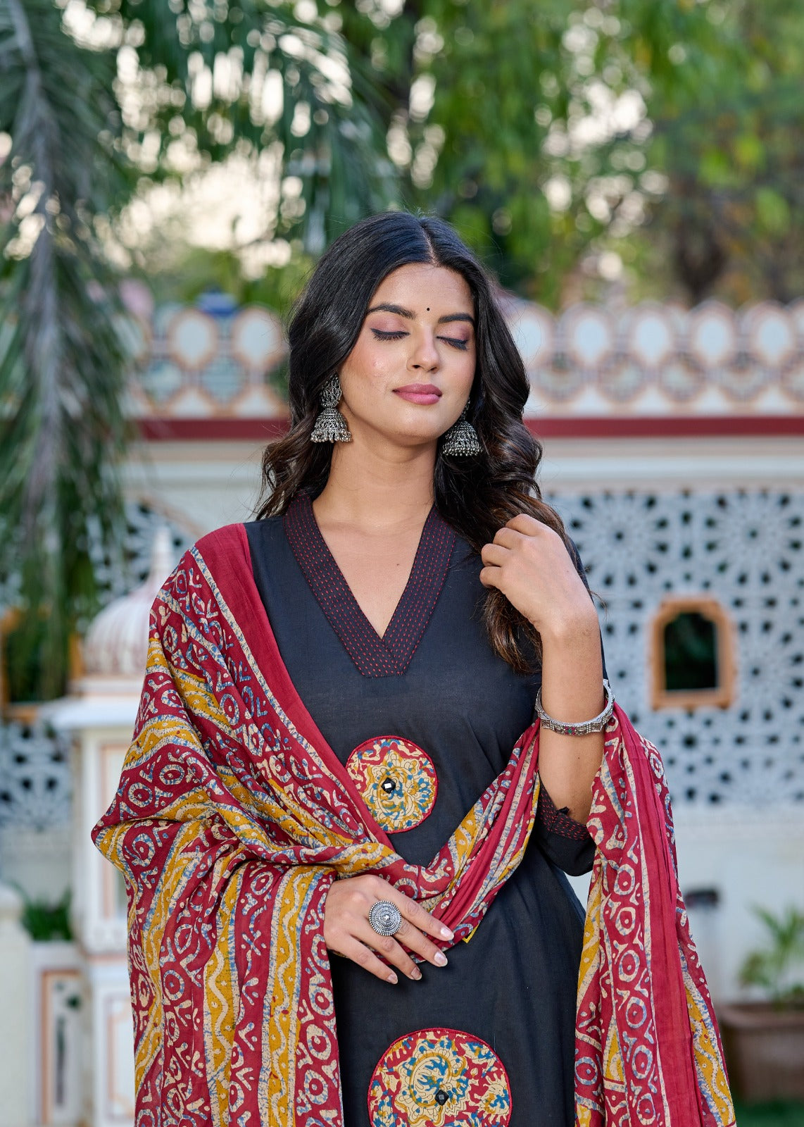 🌼 Pants: Coordinated cotton pants echo the dupatta’s ethnic print, bringing the look together with effortless harmony.