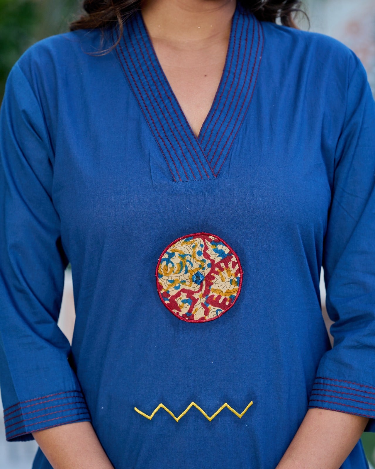 🌼 Kurti: A rich mustard hue adorned with circular embroidered accents in multicolored threads that pop like miniature mandalas. The V-neckline with a detailed border adds a graceful touch.