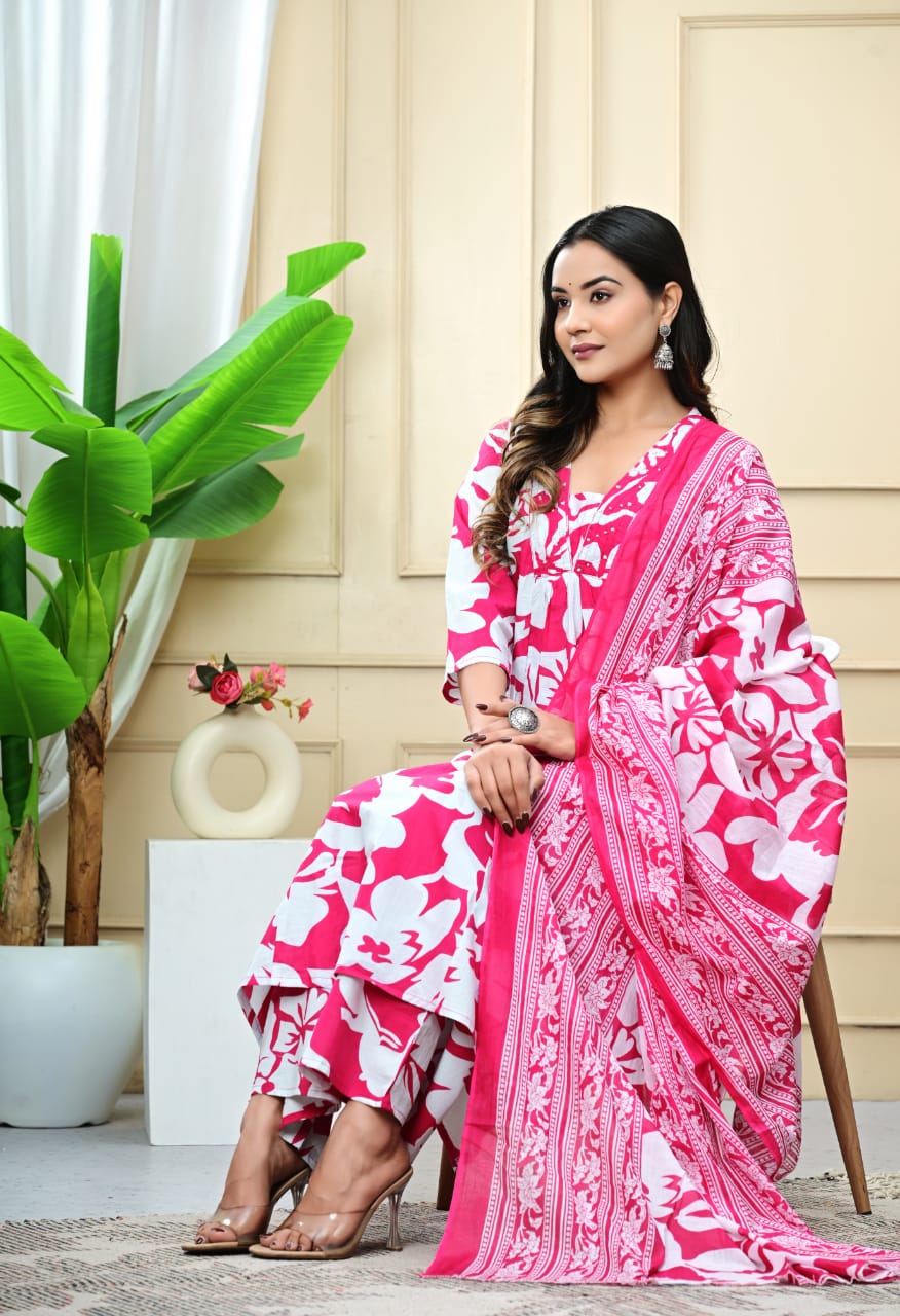 Step into timeless elegance with our beautifully handcrafted Jaipuri Print Pure Cotton Kurti Set, designed for the modern woman who cherishes comfort with style. This 3-piece ensemble includes: